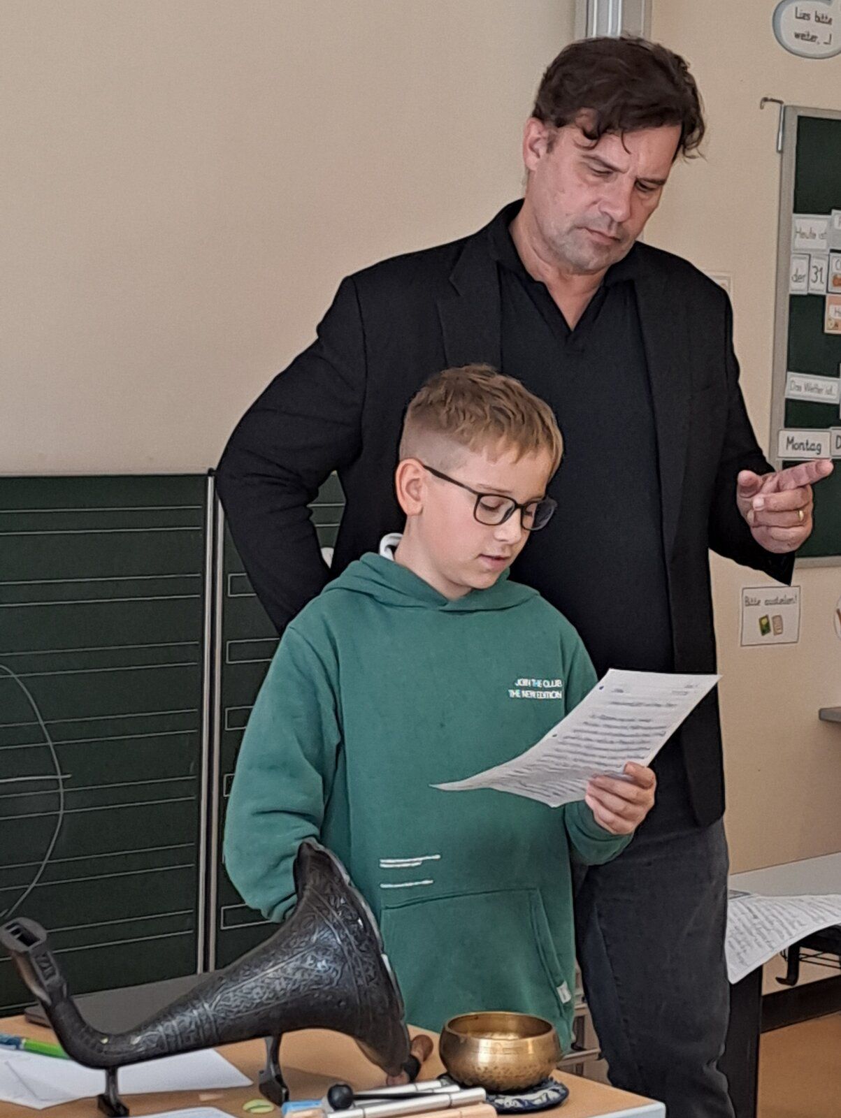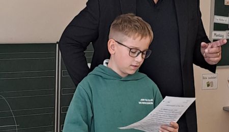 Grün gekleidet erwarteten die Kinder der 1. und 2. Klasse Herrn Pongs, der seine Zuhörer mit einem Ausschnitt aus dem Buch "Krokofil - Der Traumländer" in seinen Bann zog. Mit ausdrucksvoller Stimme unterstrichen durch Gesten, Blicke und Bewegung im Klassenzimmer erzeugte er verschiedenste Bilder im Kopf der Kinder. Diese Bilder stellen einen Reichtum dar, der niemandem genommen werden kann, erklärte Armin Pongs den Schülern. Er plädierte eindringlich dafür, bis zum 12. Lebensjahr auf Computerspiele zu verzichten, da diese sich sehr negativ auswirken. Wie im Flug verging die Vorlesestunde, die Kinder blieben hochkonzentriert. Manche besorgten sich das Buch, um zu Hause zu erfahren, wie die Geschichte von dem besonderen Krokodil endet.