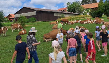 Zum Ende des Schuljahres 24/25 machte sich die 3.Klasse auf den Weg nach Schöfweg zum BioErlebnisBauernhof Zeintl. Im Rahmen des Projekts „Alltagskompetenzen“ übernachteten die Kinder auf einem Biobauernhof am Fuße des Brotjacklriegels.