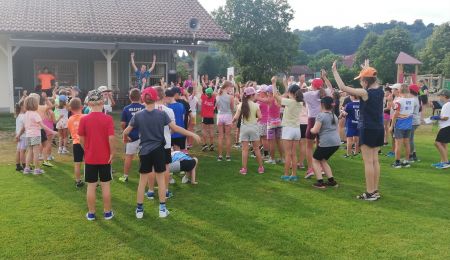 Die gesamte Schulfamilie war am 30.6. zu unserem Schulfest am Sportgelände eingeladen. Mit einem gemeinsamen Lied unter Leitung von Christiane Veith war das Motto des Abends klar: Lasst uns miteinander singen, spielen, tanzen, ole!
