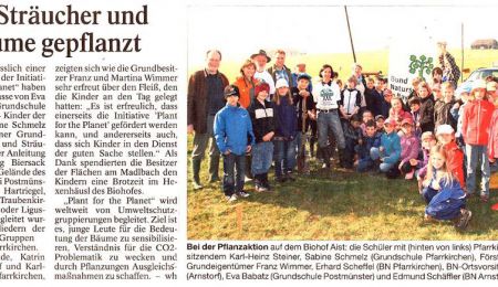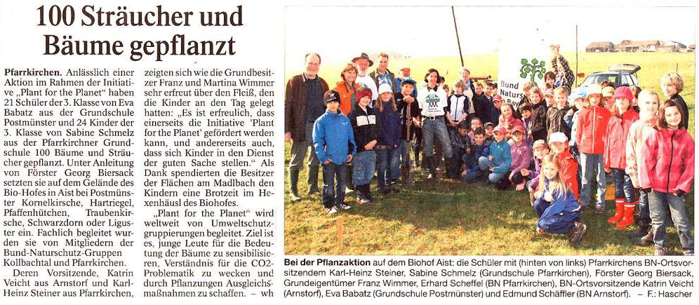 Pfarrkirchen. Anlässlich einer Aktion im Rahmen der Initiative „Plant for the Planet“ haben 21 Schüler der 3. Klasse von Eva Babatz aus der Grundschule Postmünster und 24 Kinder der 3. Klasse von Sabine Schmelz aus der Pfarrkirchner Grundschule 100 Bäume und Sträucher gepflanzt. Unter Anleitung von Förster Georg Biersack setzten sie auf dem Gelände des Bio-Hofes in Aist bei Postmünster Kornelkirsche, Hartriegel, Pfaffenhütchen, Traubenkirsche, Schwarzdorn oder Liguster ein. Fachlich begleitet wurden sie von Mitgliedern der Bund-Naturschutz-Gruppen Kollbachtal und Pfarrkirchen. Deren Vorsitzende, Katrin Veicht aus Arnstorf und Karl-Heinz Steiner aus Pfarrkirchen, zeigten sich wie die Grundbesitzer Franz und Martina Wimmer sehr erfreut über den Fleiß, den die Kinder an den Tag gelegt hatten: „Es ist erfreulich, dass einerseits die Initiative „Plant for the Planet” gefördert werden kann, und andererseits auch, dass sich Kinder in den Dienst der guten Sache stellen.“ Als Dank spendierten die Besitzer der Flächen am Madlbach den Kindern eine Brotzeit im Hexenhäusl des Biohofes.