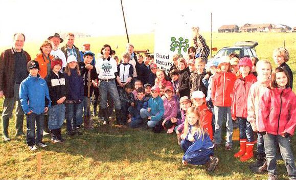 Bei der Pflanzaktion auf dem Biohof Aist: die Schüler mit (hinten von links) Pfarrkirchens BN-Ortsvorsitzenden Karl-Heinz Steiner, Sabine Schmeiz (Grundschule Pfarrkirchen), Förster Georg Biersack, Grundeigentümer Franz Wimmer, Erhard Scheffel (BN Pfarrkirchen), BN-Ortsvorsitzende Katrin Veicht (Arnstorf), Eva Babatz (Grundschule Postmünster) und Edmund Schäffler (BN Arnstorf). - F.: Hascher
