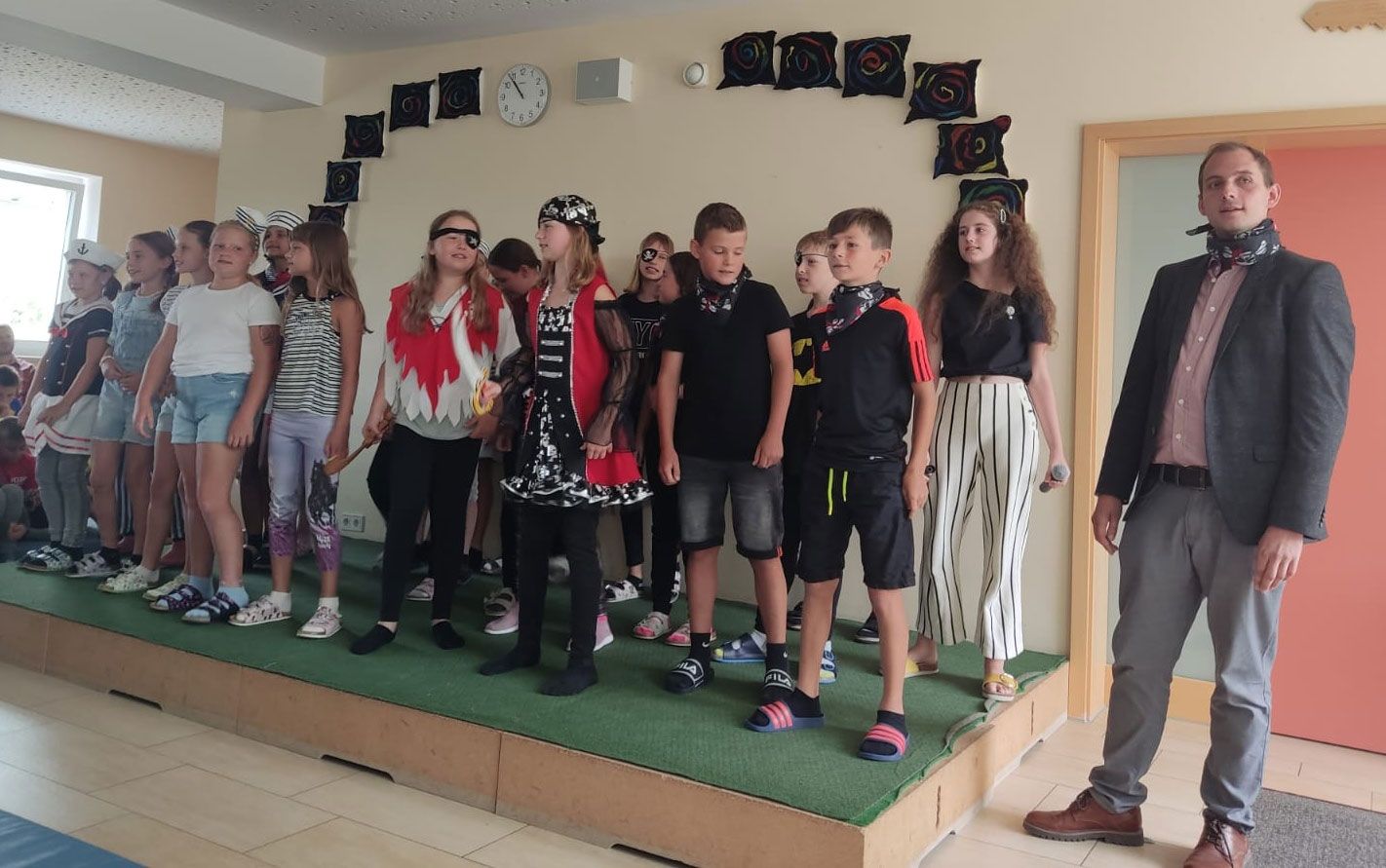 Nun zeigte die 3. Klasse ihre beeindruckenden Tanzkünste und feierte die 4. Klasse mit dem Lied: "Ein Hoch auf uns". Die Klassensprecher der 4. Klasse bedankten sich für die schöne Grundschulzeit, auf die sie gerne zurückblicken. Alle Viertklass-Schüler verwandelten sich anschließend in Matrosen und Piraten. Ihr Kapitän war natürlich Herr Bülck! Im Bühnenstück "Leinen los" machten sie klar, dass nun die Fahrt in den neuen Lebensabschnitt beginnt, auf den sie voller Tatendrang zusteuern. Der "Kapitän" wünschte seiner Mannschaft am Ende alles erdenklich Gute auf den drei neuen Inseln. Ein letztes Mal stimmte die Mannschaft ein: "Leinen los, es geht los, auf ins nächste Abenteuer!" Mit dem Lied "Schönen Gruß" verabschiedeten sie sich rockig. Die Akkordeongruppe rundete die Feierstunde mit einem Instrumentalstück ab.