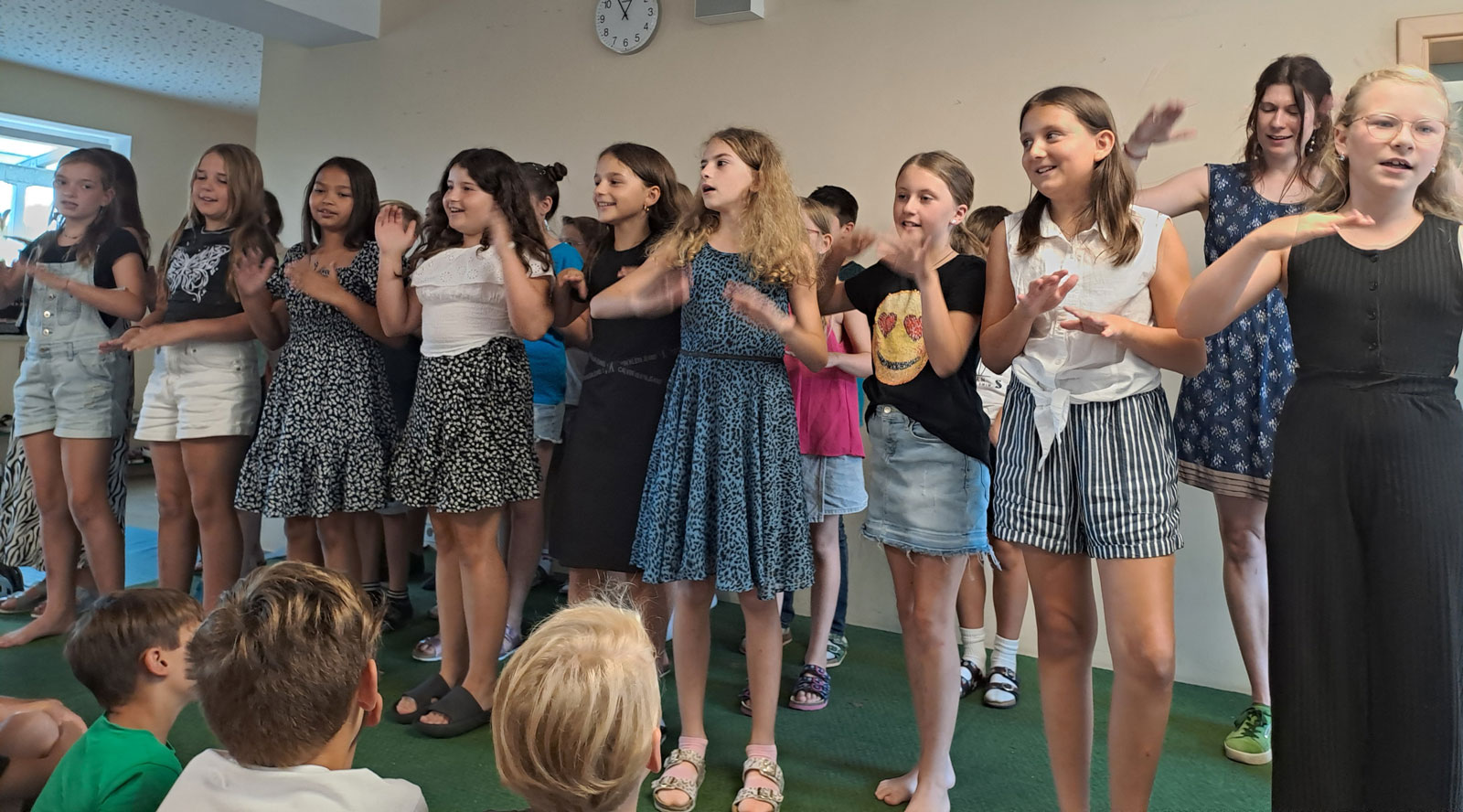 Eine fulminante Show gab auch die 4. Klasse zum Besten. Nach der Abschlussrede der Klassensprecher ging es auch schon los! Das Programm hieß „Das Quiz der Erinnerungen“ und wurde von den zwei Moderatoren eingeführt. Es ging dabei um Fragen rund um das Schuljahr der 4. Klasse, wobei die Zuschauer zwischen drei Antwortmöglichkeiten wählen sollten. Angefangen wurde mit dem Themenbereich „Ausflüge“, bei dem die Lieblingsfahrt der Klasse erraten werden musste. Darauf folgten die Auflösung und die Vorstellung auch anderer Ausflüge, unterstützt durch Bildmaterial. Nun stellten einige Jungen die beliebtesten Klassenwitze vor. Hierbei durfte anschließend auch das Publikum eigene Witze zum Besten geben. Ein Highlight dieses Jahr stellte die Fahrradprüfung der Abschlussklasse dar, welche bei Bestehen mit Wimpel und Führerschein belohnt wurde. Bei diesem Themenbereich sollten die Zuschauer eines der Prüfungsinhalte erraten, wobei die Auflösung, die 8 Schritte des Linksabbiegens, von einigen Schülern, natürlich nicht ohne Fahrradhelm, gezeigt wurden. Dem folgte eine genauere Präsentation der besonderen Tage. Abschließend ging es um die Lieblingslieder der Abgänger, wobei diese dann gleich aufgeführt wurden. Nach dem beeindruckenden Cup-Song aus dem Film „Pitch Perfect“ folgte als unvergessliches Finale „All In“. Dieser Titel beschreibt auch den Einsatz und das Engagement der Viertklässler, die nicht nur bei der Aufführung, sondern das ganze letzte Grundschuljahr über alles gegeben hatten.