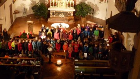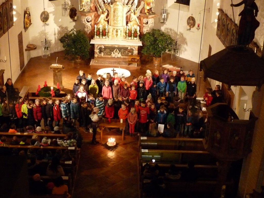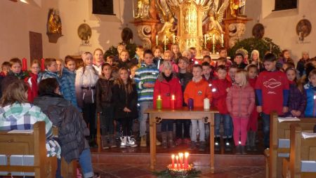 Eingeleitet wurde das weihnachtliche Spiel durch die Grußworte von Pfarrer Max Weigl. Dieser freute sich wieder ganz besonders die Kinder mit ihren Eltern, Großeltern und Lehrkräften in der Kirche begrüßen zu können. Außerdem wies er auf dem wichtigen Tag Maria Empfängnis hin, der am 08. Dezember sei, und welcher in Österreich sogar ein Feiertag ist. Den Anfang machten wie in jedem Jahr die Kinder des Kindergarten Christanger. Sie sangen das Lied „Dicke rote Kerzen“ und Kling Glöckchen Klingelingeling“. Die Vorschulkinder trugen zudem das Gedicht „Leuchte weit“ vor. Anschließend trugen die Grundschüler das Stück „Das Licht, das nicht verlöschen darf“ vor. Dieses handelt von vier Kerzen, die nacheinander verlöschen. Die erste Kerze steht für den Frieden, doch da die Menschen keinen Frieden halten, verlischt ihr Licht. Die zweite Kerze steht für den Glauben, doch da die Menschen immer weniger glauben, wird auch ihr Licht immer kleiner und erlischt schließlich ganz. Die dritte Kerze sagt sie sei die Liebe, doch da viele Menschen kein Vertrauen mehr in die Liebe haben und nur mehr sich selbst und nicht mehr die anderen sehen die sie lieb haben und denen sie Liebe entgegenbringen sollten, erlischt auch diese Kerze. Die vierte Kerze ist die Kerze der Hoffnung. So lange diese Kerze brennt können auch die anderen Kerzen wieder angezündet werden. Musikalisch umrahmt wurde das Stück von den Liedern „Wir sagen euch an, Ein Licht ist im Advent erwacht, Laßt euch anstiften, Laßt das Lied der Liebe weiterklingen, Insel der Stille“ und „Wir wünschen euch frohe Weihnacht“