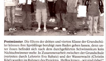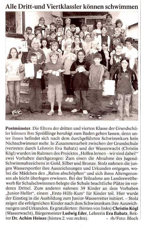 Postmünster. Die Eltern der dritten und vierten Klasse der Grundschüler können ihre Sprößlinge beruhigt zum Baden gehen lassen, denn unter ihnen befindet sich nach dem durchgeführten Schwimmkurs kein Nichtschwimmer mehr. In Zusammenarbeit zwischen der Grundschule (vertreten durch Lehrerin Eva Babatz) und der Wasserwacht (Christin Kögl) wurden im Rahmen des Projektes „Helfen lernen - wir sind dabei!“ zwei Vorhaben durchgezogen: Zum einen die Abnahme des Jugend-Schwimmabzeichens in Gold, Silber und Bronze. Stolz nahmen die jungen Wassersportler ihre Auszeichnungen und Urkunden entgegen, wobei die Mädchen den „Rahm abschöpften“ und sich ihren Altersgenossen als leicht überlegen erwiesen. Bei der Teilnahme am Landeswettbewerb für Schulschwimmen belegte die Schule beachtliche Plätze im vorderen Drittel. Zum anderen nahmen 39 Kinder an dem Vorhaben „Junior-Helfer“, einem „Erste-Hilfe-Kurs“ für Kinder teil. Hier wurde der Einstieg in die Ausbildung zum Junior-Wasserretter initiiert. - Stolz zeigen die erfolgreichen Kinder nach dem Schwimmkurs ihre Auszeichnungen und Urkunden. Es gratulierten: (hinten von links) Christin Kögl (Wasserwacht), Bürgermeister Ludwig Eder, Lehrerin Eva Babatz, Rektor Dr. Achim Heinze (hinten 2. von rechts). - rb/Foto: Bloch