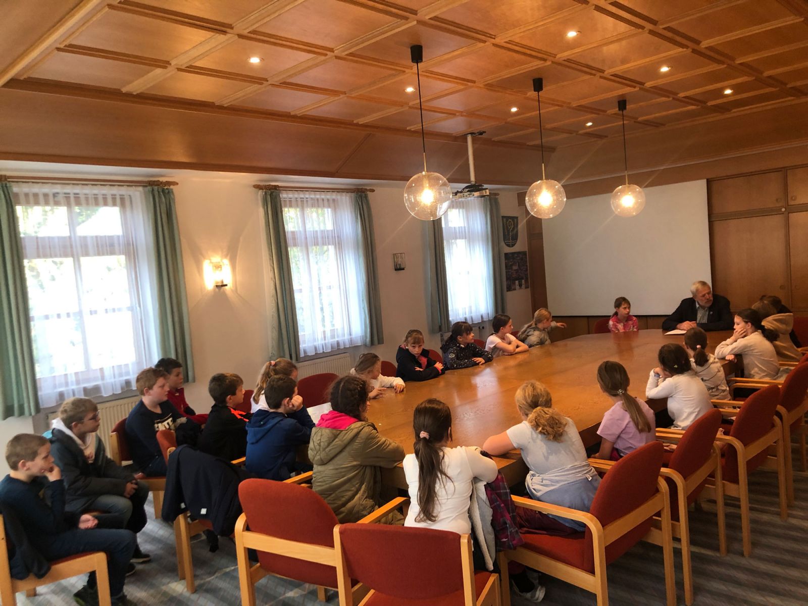 Am Ende nahmen alle im Sitzungsaal Platz. Hier werden normalerweise die öffentlichen und nicht öffentlichen Sitzungen des Gemeinderates abgehalten. Herr Bürgermeister Weindl beantwortete dort fleißig alle Fragen der Kinder, die sie sich zuvor notiert hatten.