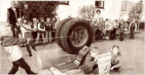 Große Augen gab es bei den Kindern beim Bremsweg des Busses. Viel Spaß hatten sie beim Abrollen von Zwillingsreifen von einer Rampe. Zwei Kinder versuchten, den Reifen aufzuhalten. Dies sollte erklären, warum es so lange dauert, bis Fahrzeuge zum Stehen kommen.
