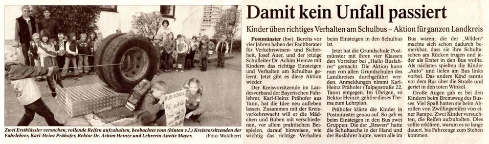 Jetzt hat die Grundschule Postmünster mit ihren vier Klassen den Vorreiter bei „Hallo Busfahrer“ gemacht. Die Aktion kann nun von allen Grundschulen des Landkreises durchgeführt werden. Anmeldungen nimmt Karl-Heinz Prähofer (Tulpenstraße 22, Tann) entgegen. Im Übrigen, so Rektor Heinze gehöre dieses Thema zum Lehrplan.
