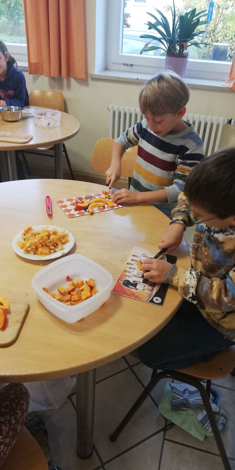 Nach intensiver Beschäftigung mit Gemüse im HSU-Unterricht durften die Kinder der 2. Klasse am 25.10. das Gemüse auch verkosten. Die cremige Gemüsesuppe hatten sie vorher gemeinsam gekocht. In sechs Gruppen wurden verschiedene Gemüsesorten gewaschen, geschält und geschnitten. Anschließend wurde das Gemüse angebraten und mit Brühe gekocht. Zum Schluss kam Sahne dazu und alles wurde püriert.