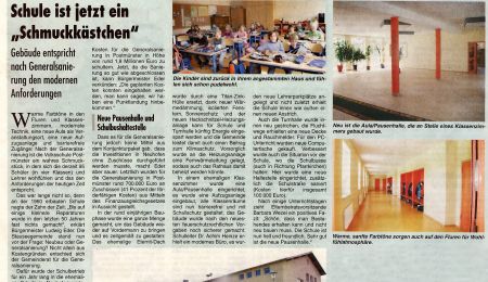 In der rund einjährigen Bauphase wurde eine ganze Menge gemacht, um das Gebäude wieder auf Vordermann zu bringen und es zeitgemäß zu gestalten: Das ehemalige Eternit-Dach wurde durch eine Titan-Zink-Hülle ersetzt, dank neuer Wärmedämmung, isolierten Fenstern, Sonnenschutz und der neuen Hackschnitzel-Heizungsanlage kann für Schule und Turnhalle künftig Energie eingespart werden und die Gemeinde leistet damit auch einen Beitrag zum Klimaschutz. Vorsorglich wurde an die Heizungsanlage eine Fernwärmeleitung gelegt, sodass auch das Rathaus damit beheizt werden könnte.