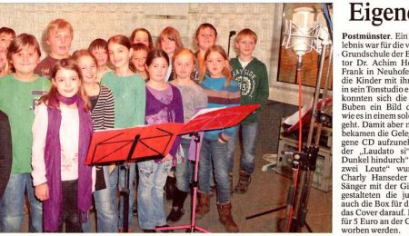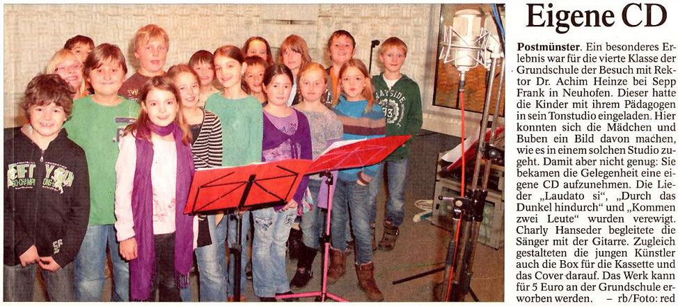 Postmünster. Ein besonderes Erlebnis war für die vierte Klasse der Grundschule der Besuch mit Rektor Dr. Achim Heinze bei Sepp Frank in Neuhofen. Dieser hatte die Kinder mit ihrem Pädagogen in sein Tonstudio eingeladen. Hier konnten sich die Mädchen und Buben ein Bild davon machen, wie es in einem solchen Studio zugeht. Damit aber nicht genug: Sie bekamen die Gelegenheit eine eigene CD aufzunehmen. Die Lieder „Laudato si“, „Durch das Dunkel hindurch“ und „Kommen zwei Leute" wurden verewigt. Charly Hanseder begleitete die Sänger mit der Gitarre. Zugleich gestalteten die jungen Künstler auch die Box für die Kassette und das Cover.darauf. Das Werk kann für 5 Euro an der Grundschule erworben werden. - rb/Foto: red