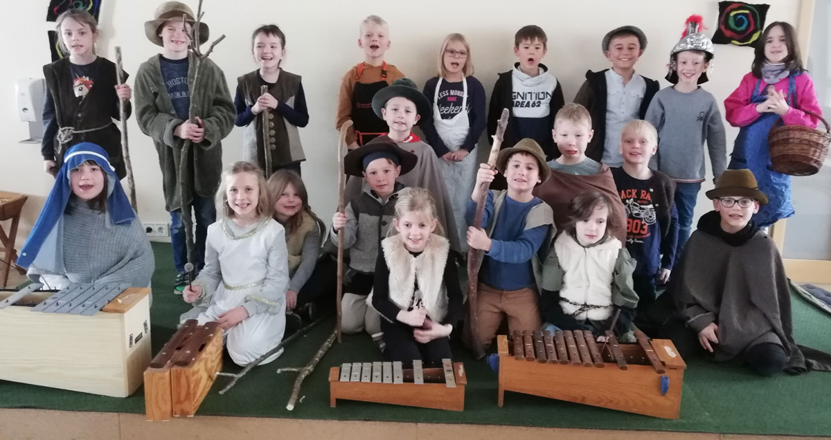 Das weihnachtliche Geschehen von der Herbergsuche und den Hirten, die zur Krippe kommen, stellte die 2. Klasse dar, die auch das Lied „Jesulein, schöns Kindelein“ darbot. Nun kamen auch die verschiedensten Tiere zur Krippe, vorgestellt durch Schüler der 1. Klasse. Es folgte das Lied „Schneeflöckchen“.