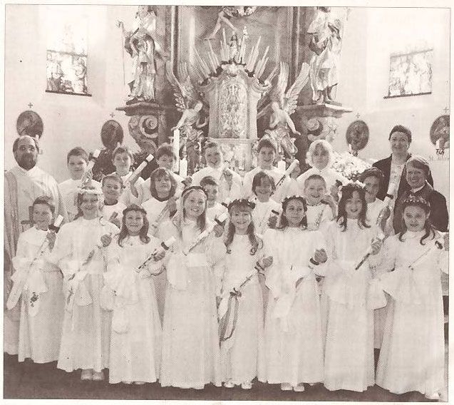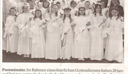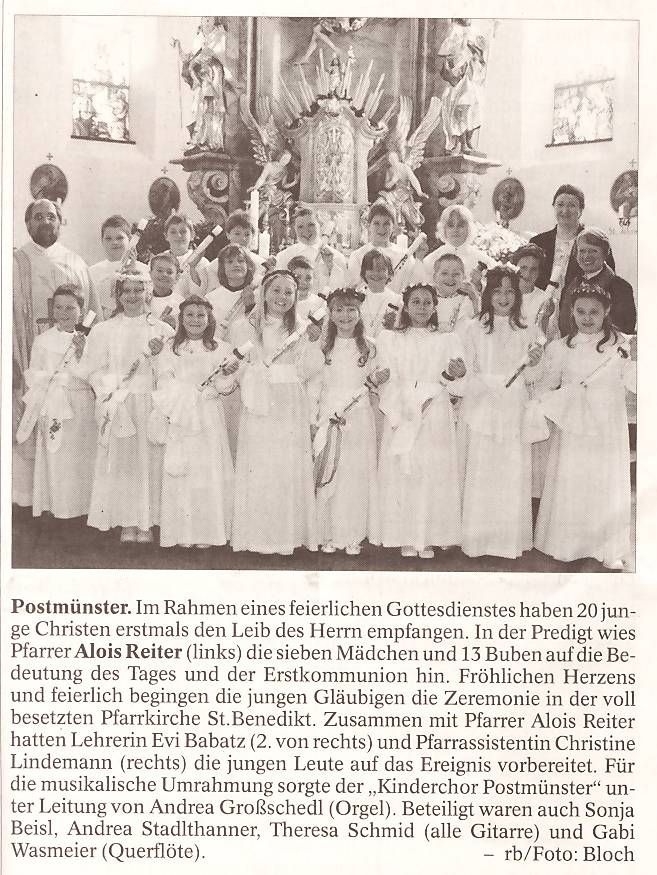 Postmünster. Im Rahmen eines feierlichen Gottesdienstes haben 20 junge Christen erstmals den Leib des Herrn empfangen. In der Predigt wies Pfarrer Alois Reiter (links) die sieben Mädchen und 13 Buben auf die Bedeutung des Tages und der Erstkommunion hin. Fröhlichen Herzens und feierlich begingen die jungen Gläubigen die Zeremonie in der voll besetzten Pfarrkirche St.Benedikt. Zusammen mit Pfarrer Alois Reiter hatten Lehrerin Evi Babatz (2. von rechts) und Pfarrassistentin Christine Lindemann (rechts) die jungen Leute auf das Ereignis vorbereitet. Für die musikalische Umrahmung sorgte der „Kinderchor Postmünster“ unter Leitung von Andrea Großschedl (Orgel). Beteiligt waren auch Sonja Beisl, Andrea Stadlthanner, Theresa Schmid (alle Gitarre) und Gabi Wasmeier (Querflöte). - rb/Foto: Bloch