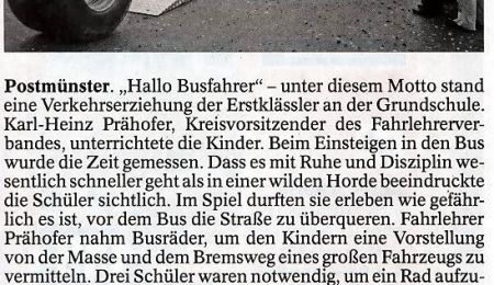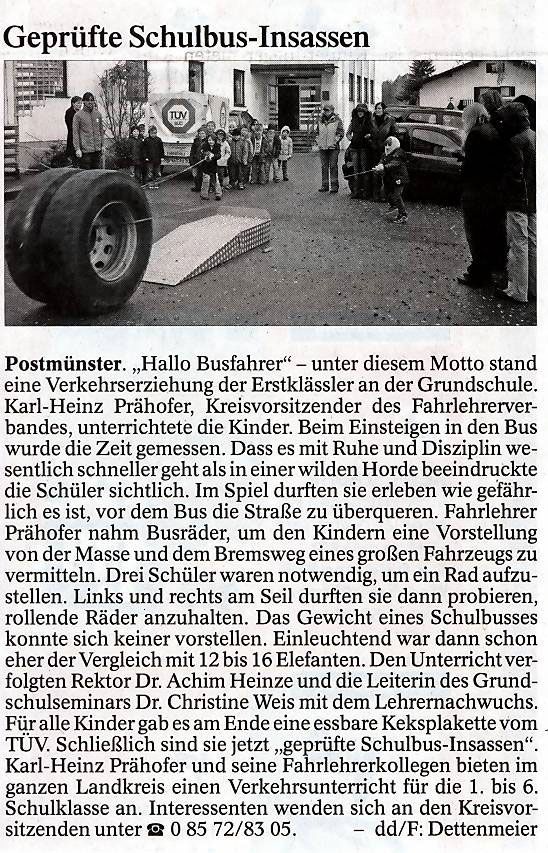Postmünster. „Hallo Busfahrer“ - unter diesem Motto stand eine Verkehrserziehung der Erstklässler an der Grundschule. Karl-Heinz Prähofer, Kreisvorsitzender des Fahrlehrerverbandes, unterrichtete die Kinder. Beim Einsteigen in den Bus wurde die Zeit gemessen. Dass es mit Ruhe und Disziplin wesentlich schneller geht als in einer wilden Horde beeindruckte die Schüler sichtlich. Im Spiel durften sie erleben wie gefährlich es ist, vor dem Bus die Straße zu überqueren. Fahrlehrer Prähofer nahm Busräder, um den Kindern eine Vorstellung von der Masse und dem Bremsweg eines großen Fahrzeugs zu vermitteln. Drei Schüler waren notwendig, um ein Rad aufzustellen. Links und rechts am Seil durften sie dann probieren, rollende Räder anzuhalten. Das Gewicht eines Schulbusses konnte sich keiner vorstellen. Einleuchtend war dann schon eher der Vergleich mit 12 bis 16 Elefanten. Den Unterricht verfolgten Rektor Dr. Achim Heinze und die Leiterin des Grundschulseminars Dr. Christine Weis mit dem Lehrernachwuchs. Füralle Kinder gab esam Ende eine essbare Keksplakette vom . TUV. Schließlich sind sie jetzt „geprüfte Schulbus-Insassen“. Karl-Heinz Prähofer und seine Fahrlehrerkollegen bieten im ganzen Landkreis einen Verkehrsunterricht für die 1. bis 6. Schulklasse an. Interessenten wenden sich an den Kreisvorsitzenden unter 0 85 72/83 05. - dd/F: Dettenmeier