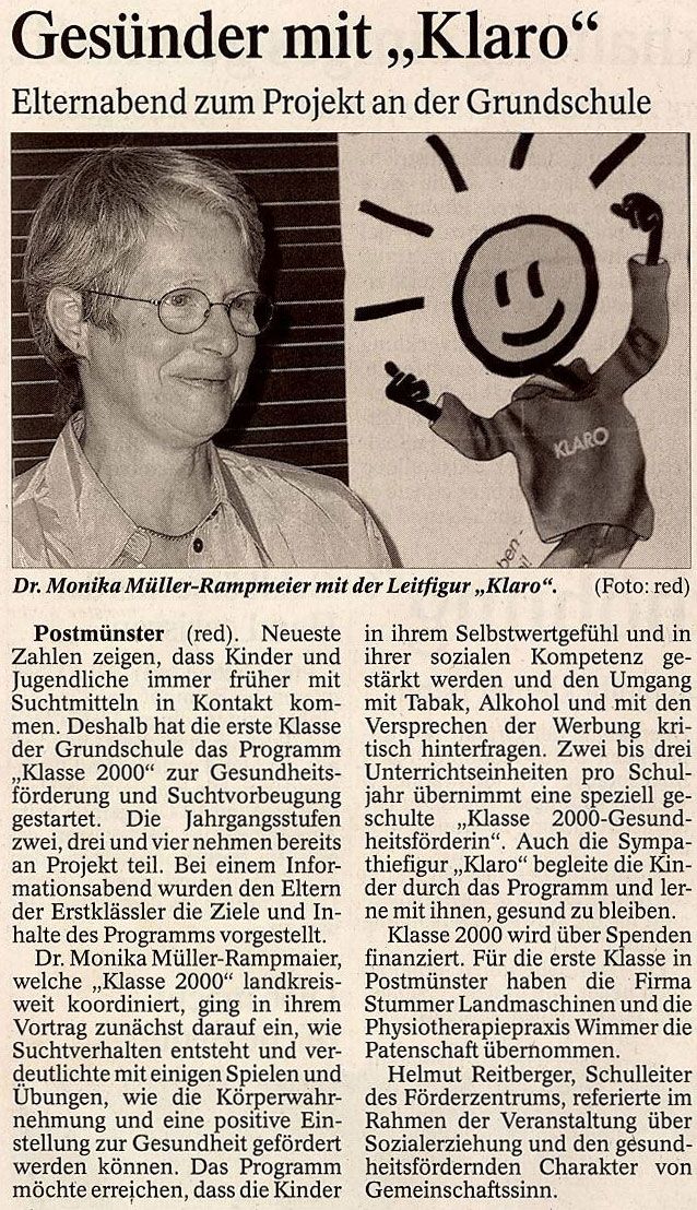 Dr. Monika Müller-Rampmaier, welche „Klasse 2000“ landkreisweit koordiniert, ging in ihrem Vortrag zunächst darauf ein, wie Suchtverhalten entsteht und verdeutlichte mit einigen Spielen und Übungen, wie die Körperwahrnehmung und eine positive Einstellung zur Gesundheit gefördert werden können. Das Programm möchte erreichen, dass die Kinder in ihrem Selbstwertgefühl und in ihrer sozialen Kompetenz gestärkt werden und den Umgang mit Tabak, Alkohol und mit den Versprechen der Werbung kritisch hinterfragen. Zwei bis drei Unterrichtseinheiten pro Schuljahr übernimmt eine speziell geschulte „Klasse 2000-Gesundheitsförderin“. Auch die Sympathiefigur „Klaro“ begleite die Kinder durch das Programm und lerne mit ihnen, gesund zu bleiben.