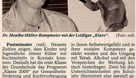 Postmünster (red). Neueste Zahlen zeigen, dass Kinder und Jugendliche immer früher mit Suchtmitteln in Kontakt kommen. Deshalb hat die erste Klasse der Grundschule das Programm „Klasse 2000“ zur Gesundheitsförderung und Suchtvorbeugung gestartet. Die Jahrgangsstufen zwei, drei und vier nehmen bereits an Projekt teil. Bei einem Informationsabend wurden den Eltern der Erstklässler die Ziele und Inhalte des Programms vorgestellt.