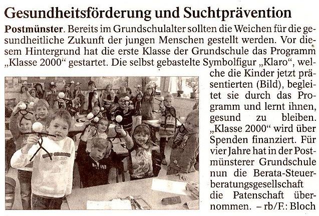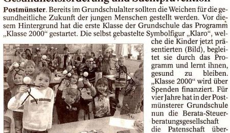 Postmünster. Bereits im Grundschulalter sollten die Weichen für die gesundheitliche Zukunft der jungen Menschen gestellt werden. Vor diesem Hintergrund hat die erste Klasse der Grundschule das Programm „Klasse 2000“ gestartet. Die selbst gebastelte Symbolfigur „Klaro“, welche die Kinder jetzt präsentierten (Bild), begleitet sie durch das Programm und lernt ihnen, gesund zu bleiben. „Klasse 2000“ wird über Spenden finanziert. Für vier Jahre hat in der Postmünsterer Grundschule nun die Berata-Steuerberatungsgesellschaft die Patenschaft übernommen. -rb/F.: Bloch