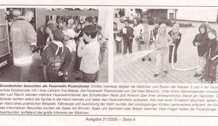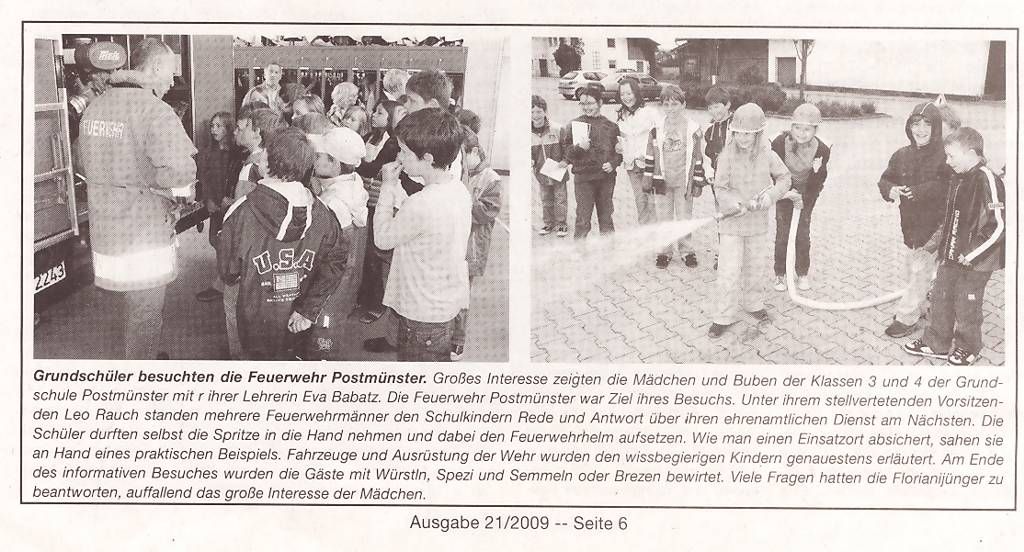 Großes Interesse zeigten die Mädchen und Buben der Klassen 3 und 4 der Grundschule Postmünster mit ihrer Lehrerin Eva Babatz. Die Feuerwehr Postmünster war Ziel ihres Besuchs. Unter ihrem stellvertetenden Vorsitzenden Leo Rauch standen mehrere Feuerwehrmänner den Schulkindern Rede und Antwort über ihren ehrenamtlichen Dienst am Nächsten. Die Schüler durften selbst die Spritze in die Hand nehmen und dabei den Feuerwehrheim aufsetzen. Wie man einen Einsatzort absichert, sahen sie an Hand eines praktischen Beispiels. Fahrzeuge und Ausrüstung der Wehr wurden den wissbegierigen Kindern genauestens erläutert. Am Ende des informativen Besuches wurden die Gäste mit Würstln, Spezi und Semmeln oder Brezen bewirtet. Viele Fragen hatten die Florianijünger zu beantworten, auffallend das große Interesse der Mädchen.
