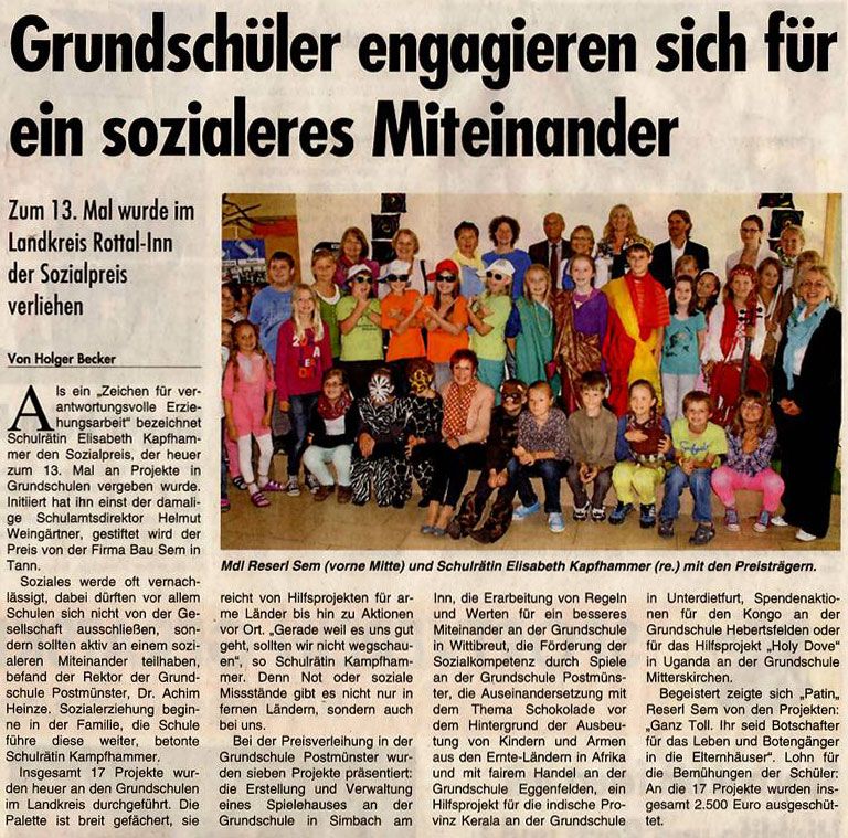 Bei der Preisverleihung in der Grundschule Postmünster wurden sieben Projekte präsentiert: die Erstellung und Verwaltung eines Spielehauses an der Grundschule in Simbach am Inn, die Erarbeitung von Regeln und Werten für ein besseres Miteinander an der Grundschule in Wittibreut, die Förderung der Sozialkompetenz durch Spiele an der Grundschule Postmünster, die Auseinandersetzung mit dem Thema Schokolade vor dem Hintergrund der Ausbeutung von Kindern und Armen aus den Ernte-Ländern in Afrika und mit fairem Handel an der Grundschule Eggenfelden, ein Hilfsprojekt für die indische Provinz Kerala an der Grundschule in Unterdietfurt, Spendenaktionen für den Kongo an der Grundschule Hebertsfelden oder für das Hifsprojekt „Holy Dove“ in Uganda an der Grundschule Mitterskirchen.