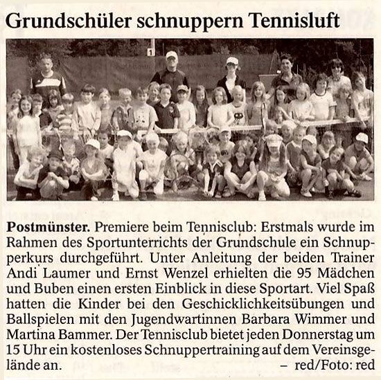 Postmünster. Premiere beim Tennisclub: Erstmals wurde im Rahmen des Sportunterrichts der Grundschule ein Schnupperkurs durchgeführt. Unter Anleitung der beiden Trainer Andi Laumer und Ernst Wenzel erhielten die 95 Mädchen und Buben einen ersten Einblick in diese Sportart. Viel Spaß hatten die Kinder bei den Geschicklichkeitsübungen und Ballspielen mit den Jugendwartinnen Barbara Wimmer und Martina Bammer. Der Tennisclub bietet jeden Donnerstag um 15 Uhr ein kostenloses Schnuppertraining auf dem Vereinsgelände an. - red/Foto: red