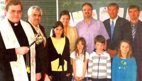 Eine Hauptrolle dabei spielten die Kinder. Sie prägten die Veranstaltung mit ihren Auftritten, die das Publikum amüsiert und mit viel anerkennendem Beifall aufnahm. Die Mädchen und Buben sangen und spielten, dass es eine Freude war. Gekonnt durch das Programm führten Viola Haugeneder und Maximilian Altmann aus der dritten Klasse. Diese hieß die Gäste auch mit dem einem Begrüßungslied - begleitet von Rektor Dr. Achim Heinze auf der Gitarre - herzlich willkommen. Weitere Aufführungen waren das „Schulhaus-ABC“ (4. Klasse), ein Schattenspiel der Schulspielgruppe und „Gute Wünsche zur Schulhauseinweihung“ (1. Klasse). Bei dem Stück „Unsere Schulgeschichte“ (2. Klasse) stellten die Kinder frühere und den heutigen Schulleiter dar. Für viel Heiterkeit sorgte dabei Rochus Tüller, der mit Fahrrad und Helm ausgestattet auf die Radsportbegeisterung des amtierenden Rektors Dr. Heinze anspielte. Viel Talent auf dem Klavier zeigte später Annemarie Weibel, die auf dem Instrument ein schönes Stück zum Besten gab.