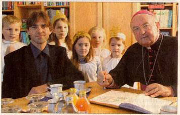 Nach einem Tag Pause besuchte er dann die Pfarrei Postmünster. Zusammen mit Pfarrer Alois Reiter und Bürgermeister Ludwig Eder führte ihn sein Weg als erstes in die Grundschule, wo ihn Rektor Dr. Achim Heinze und die Kinder mit Gesang, Spiel und Musik überraschten. Schraml nahm sich Zeit um mit ihnen über religiöse Dinge zu reden und trug sich abschließend ins Gästebuch der Grundschule ein.