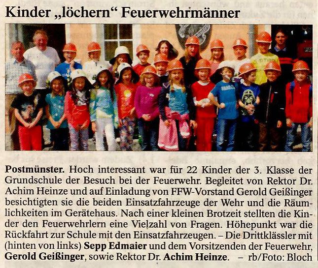Postmünster. Hoch interessant war für 22 Kinder der 3. Klasse der Grundschule der Besuch bei der Feuerwehr. Begleitet von Rektor Dr. Achim Heinze und auf Einladung von FFW-Vorstand Gerold Geißinger besichtigten sie die beiden Einsatzfahrzeuge der Wehr und die Räumlichkeiten im Gerätehaus. Nach einer kleinen Brotzeit stellten die Kinder den Feuerwehrlern eine Vielzahl von Fragen. Höhepunkt war die Rückfahrt zur Schule mit den Einsatzfahrzeugen. - rb