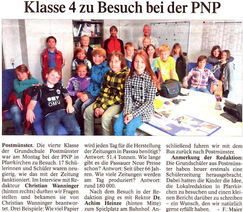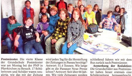 Postmünster. Die vierte Klasse der Grundschule Postmünster war am Montag bei der PNP in Pfarrkirchen zu Besuch. 17 Schülerinnen und Schüler waren neugierig, wie das mit der Zeitung funktioniert. Im Interview mit Redakteur Christian Wanninger (hinten rechts) durften wir Fragen stellen und bekamen sie von Christian Wanninger beantwortet. Drei Beispiele: Wie viel Papier wird jeden Tag für die Herstellung der Zeitungen in Passau benötigt? Antwort: 51,4 Tonnen. Wie lange gibt es die Passauer Neue Presse schon? Antwort: Seit über 66 Jahren. Wie viele Zeitungen werden am Tag produziert? Antwort: rund 180 000.
