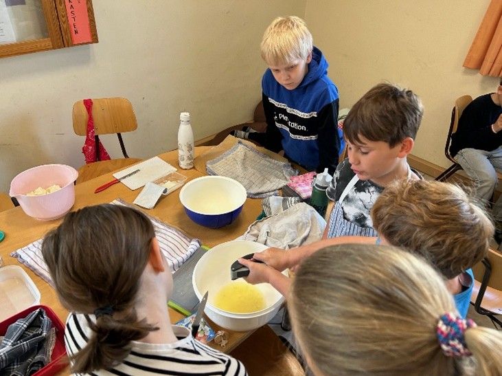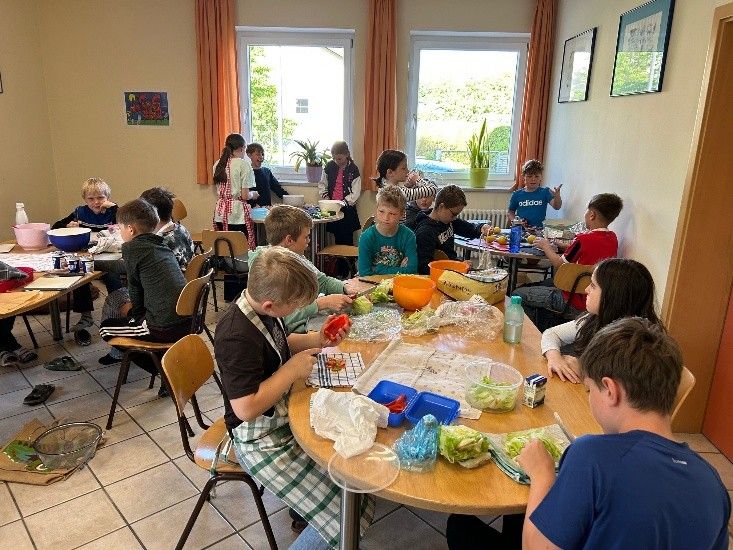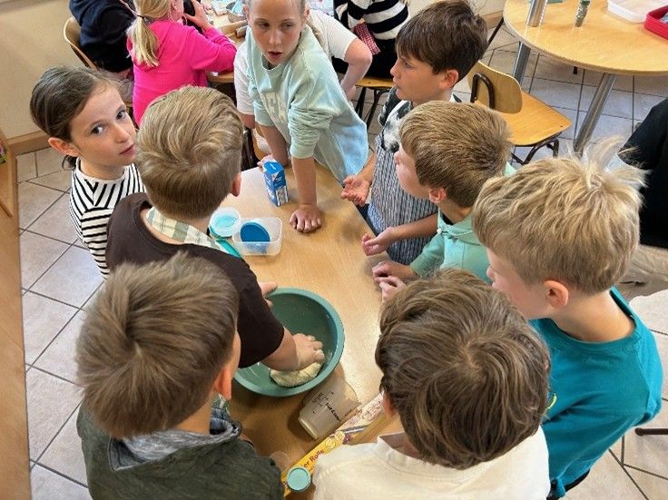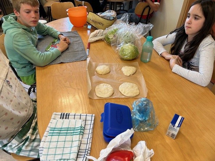 Am 7. Mai fand der erste Kochkurs der vierten Klasse statt. Die Schülerinnen und Schüler wünschten sich, an diesem Tag einmal einen Döner zuzubereiten. Zunächst wurden die verschiedenen Zutaten und ihre Zubereitung besprochen. Gemeinsam wurde der Brotteig hergestellt und kräftig durchgeknetet.