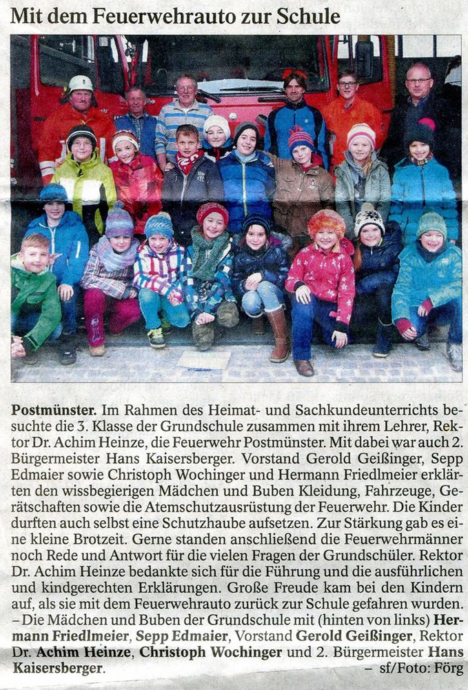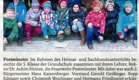 Postmünster. Im Rahmen des Heimat- und Sachkundeunterrichts besuchte die 3. Klasse der Grundschule zusammen mit ihrem Lehrer, Rektor Dr. Achim Heinze, die Feuerwehr Postmünster. Mit dabei war auch 2. Bürgermeister Hans Kaisersberger. Vorstand Gerold Geißinger, Sepp Edmaier sowie Christoph Wochinger und Hermann Friedlmeier erklärten den wissbegierigen Mädchen und Buben Kleidung, Fahrzeuge, Gerätschaften sowie die Atemschutzausrüstung der Feuerwehr. Die Kinder durften auch selbst eine Schutzhaube aufsetzen. Zur Stärkung gab es eine kleine Brotzeit. Gerne standen anschließend die Feuerwehrmänner noch Rede und Antwort für die vielen Fragen der Grundschüler. Rektor Dr. Achim Heinze bedankte sich für die Führung und die ausführlichen und kindgerechten Erklärungen. Große Freude kam bei den Kindern auf, als sie mit dem Feuerwehrauto zurück zur Schule gefahren wurden. - sf