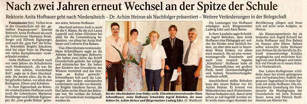 Sie sei eine verantwortungsvolle Erzieherin und auch eine, musisch begabte „Künstlerin“. Hofbauer habe all Ihre Dienstpflichten mit großem Fleiß, steter Gewissenhaftigkeit und hohem Verantwortungsbewußtsein erfüllt. Anschließend stellte Behnken kurz den neuen Rektor vor: Dr. Achim Heinze. Er kommt von Mitterskirchen nach Postmünster. Heinze bedankte sich, dass er jetzt schon so toll begrüßt worden sei. Er wolle einen engen Kontakt zur Bevölkerung pflegen und freue sich auf sehe neue Aufgabe, so Heinze.