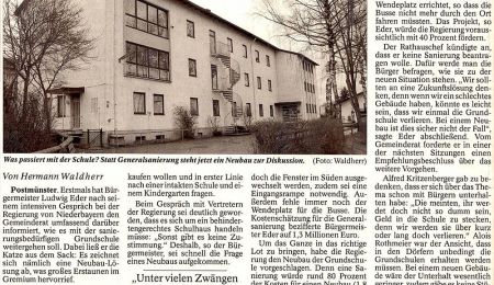 Um das Ganze in das richtige Lot zu bringen, habe die Regierung den Neubau der Grundschule vorgeschlagen. Denn eine Sanierung würde rund 80 Prozent der Kosten für einen Neubau (1,8 Millionen Euro ohne Grund) ausmachen. In diesem Zusammenhang wies Eder darauf hin, dass das Schulgebäude bereits 50 Jahre alt sei: „Bei einer Sanierung müssten wir mit vielen Zwängen viel Geld ausgeben.“