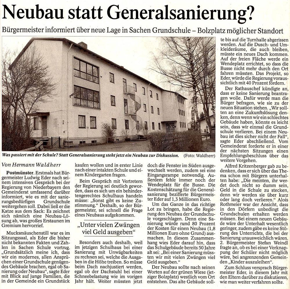 Postmünster. Erstmals hat Bürgermeister Ludwig Eder nach seinem intensiven Gespräch bei der Regierung von Niederbayern den Gemeinderat umfassend darüber informiert, wie es mit der sanierungsbedürfigen Grundschule weitergehen soll. Dabei ließ er die Katze aus dem Sack: Es zeichnet sich nämlich eine Neubau-Lösung ab, was großes Erstaunen im Gremium hervorrief.