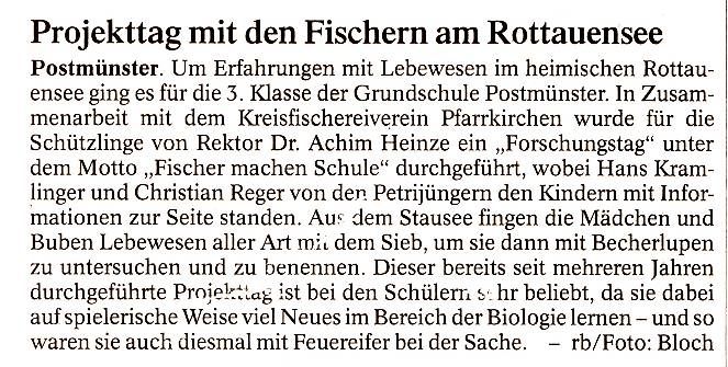 Postmünster. Um Erfahrungen mit Lebewesen im heimischen Rottauensee ging es für die 3. Klasse der Grundschule Postmünster. In Zusammenarbeit mit dem Kreisfischereiverein Pfarrkirchen wurde für die Schützlinge von Rektor Dr. Achim Heinze ein „Forschungstag“ unter dem Motto „Fischer machen Schule“ durchgeführt, wobei Hans Kramlinger und Christian Reger von den Petrijüngern den Kindern mit Informationen zur Seite standen. Aus dem Stausee fingen die Mädchen und Buben Lebewesen aller Art mit dem Sieb, um sie dann mit Becherlupen zu untersuchen und zu benennen. Dieser bereits seit mehreren Jahren durchgeführte Projekttag ist bei den Schülern sehr beliebt, da sie dabei auf spielerische Weise viel Neues im Bereich der Biologie lernen - und so waren sie auch diesmal mit Feuereifer bei der Sache. - rb/Foto: Bloch