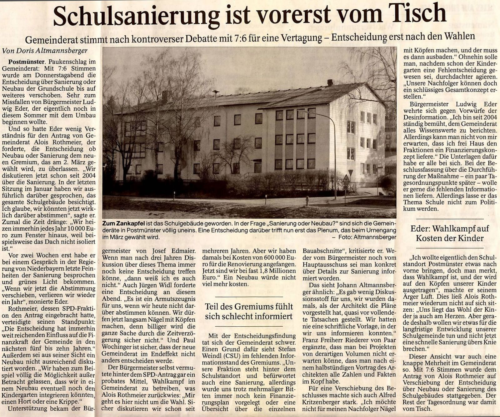„Ich wollte eigentlich den Schulstandort Postmünster etwas nach vorne bringen, doch man merkt, dass Wahlkampf ist, und der wird auf den Köpfen unserer Kinder ausgetragen“, machte er seinem Ärger Luft. Dies ließ Alois Rothmeier wiederum nicht auf sich sitzen: „Uns liegt das Wohl der Kinder ja auch am Herzen. Aber gerade deshalb wollen wir etwas für die langfristige Entwicklung unserer Schulgemeinde tun und nicht jetzt eine schnelle Sanierung übers Knie brechen.“ Dieser Ansicht war auch eine knappe Mehrheit im Gemeinderat so. Mit 7:6 Stimmen wurde dem Antrag von Alois Rothmeier auf Verschiebung der Entscheidung über Neubau oder Sanierung des Schulgebäudes stattgegeben. Der Rest der Tagesordnung war damit vom Tisch.