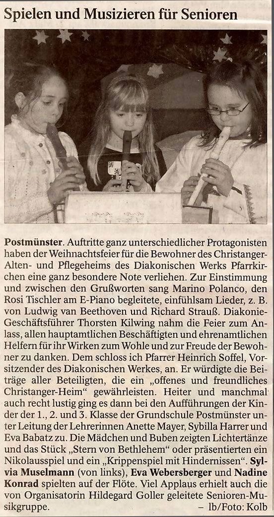 Postmünster. Auftritte ganz unterschiedlicher Protagonisten haben der Weihnachtsfeier für die Bewohner des Christanger-Alten- und Pflegeheims des Diakonischen Werks Pfarrkirchen eine ganz besondere Note verliehen. Zur Einstimmung und zwischen den Grußworten sang Marino Polanco, den Rosi Tischler am E-Piano begleitete, einfühlsam Lieder, z. B. von Ludwig van Beethoven und Richard Strauß. Diakonie-Geschäftsführer Thorsten Kilwing nahm die Feier zum Anlass, allen hauptamtlichen Beschäftigten und ehrenamtlichen Helfern für ihr Wirken zum Wohle und zur Freude der Bewohner zu danken. Dem schloss ich Pfarrer Heinrich Soffel, Vorsitzender des Diakonischen Werkes, an. Er würdigte die Beiträge aller Beteiligten, die ein „offenes und freundliches Christanger-Heim“ gewährleisten. Heiter und manchmal auch recht lustig ging es dann bei den Aufführungen der Kinder der 1., 2. und 3. Klasse der Grundschule Postmünster unter Leitung der Lehrerinnen Anette Mayer, Sybilla Harrer und Eva Babatz zu. Die Mädchen und Buben zeigten Lichtertänze und das Stück „Stern von Bethlehem“ oder präsentierten ein Nikolausspiel und ein „Krippenspiel mit Hindernissen“. Sylvia Muselmann (von links), Eva Webersberger und Nadine Konrad spielten auf der Flöte. Viel Applaus erhielt auch die von Organisatorin Hildegard Goller geleitete Senioren-Musikgruppe. - lb/Foto: Kolb
