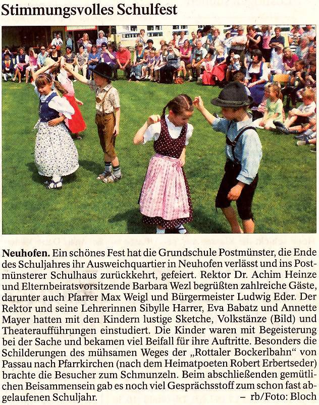 Neuhofen. Ein schönes Fest hat die Grundschule Postmünster, die Ende des Schuljahres ihr Ausweichquartier in Neuhofen verlässt und ins Postmünsterer Schulhaus zurückkehrt, gefeiert. Rektor Dr. Achim Heinze und Elternbeiratsvorsitzende Barbara Wezel begrüßten zahlreiche Gäste, darunter auch Pfarrer Max Weigl und Bürgermeister Ludwig Eder. Der Rektor und seine Lehrerinnen Sibylle Harrer, Eva Babatz und Annette Mayer hatten mit den Kindern lustige Sketche, Volkstänze (Bild) und Theateraufführungen einstudiert. Die Kinder waren mit Begeisterung bei der Sache und bekamen viel Beifall für ihre Auftritte. Besonders die Schilderungen des mühsamen Weges der „Rottaler Bockerlbahn“ von Passau nach Pfarrkirchen (nach dem Heimatpoeten Robert Erbertseder) brachte die Besucher zum Schmunzeln. Beim abschließenden gemütlichen Beisammensein gab es noch viel Gesprächsstoff zum schon fast abgelaufenen Schuljahr. - rb/Foto: Bloch