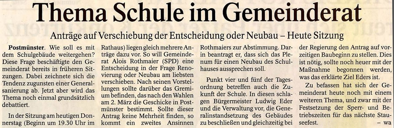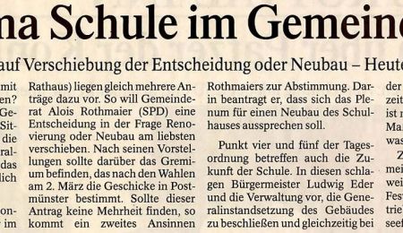 In der Sitzung am heutigen Donnerstag (Beginn um 19.30 Uhr im Rathaus) liegen gleich mehrere Anträge dazu vor. So will Gemeinderat Alois Rothmaier (SPD) eine Entscheidung in der Frage Renovierung oder Neubau am liebsten verschieben. Nach seinen Vorstellungen sollte darüber das Gremium befinden, dasnach den Wahlen am 2. März die Geschicke in Postmünster bestimmt. Sollte dieser Antrag keine Mehrheit finden, so kommt ein zweites Ansinnen Rothmaiers zur Abstimmung. Darin beantragt er, dass sich das Plenum für einen Neubau des Schulhauses aussprechen soll.