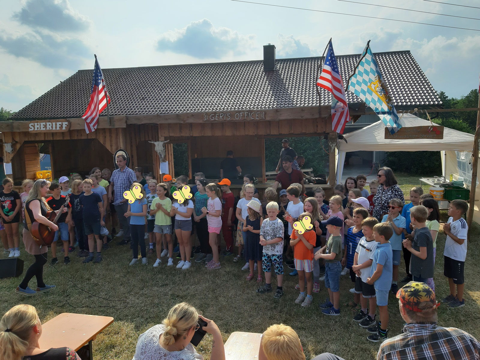 Die gesamte Schulfamilie war am 30.6. zu unserem Schulfest am Sportgelände eingeladen. Mit einem gemeinsamen Lied unter Leitung von Christiane Veith war das Motto des Abends klar: Lasst uns miteinander singen, spielen, tanzen, ole!