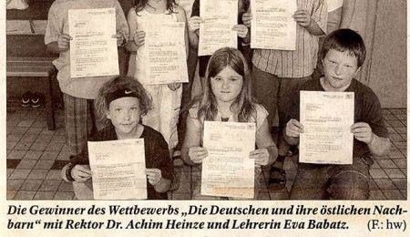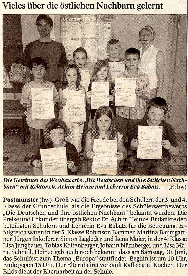 Postmünster (hw). Groß war die Freude bei den Schülern der 3. und 4. Klasse der Grundschule, als die Ergebnisse des Schülerwettbewerbs „Die Deutschen und ihre östlichen Nachbarn“ bekannt wurden. Die Preise und Urkunden übergab Rektor Dr. Achim Heinze. Er dankte den beteiligten Schülern und Lehrerin Eva Babatz für die Betreuung. Erfolgreich waren in der 3. Klasse Robinson Bammer, Martina Baumgartner, Jürgen Inkoferer, Simon Lagleder und Lena Maier, in der 4. Klasse Lisa Jungbauer, Tobias Kaltenberger, Johann Nürnberger und Lisa Maria Schnall. Heinze gab auch noch bekannt, dass am Samstag, 30. Juni, das Schulfest zum Thema „Europa“ stattfindet. Beginn ist um 10 Uhr, Ende gegen 13 Uhr. Der Elternbeirat verkauft Kaffee und Kuchen. Der Erlös dient der Elternarbeit an der Schule.