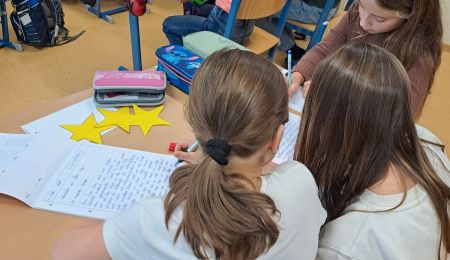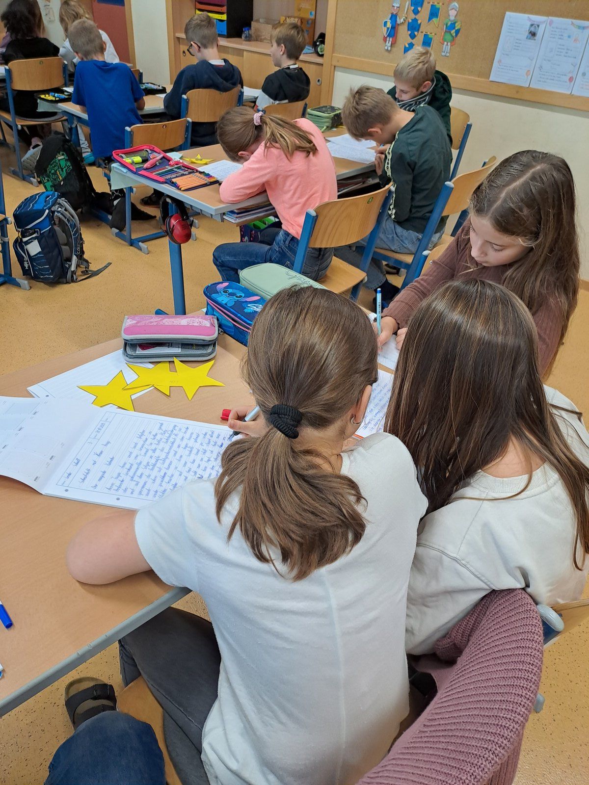 Nun waren die Schüler gefordert: Sie durften die Reise des magischen Quartetts selber weiterschreiben. Gekonnt gab der Autor hilfreiche Tipps, damit die eigene Geschichte spannend wurde. Unerwartete Wendungen wurden eingebaut und wörtliche Reden durften nicht fehlen, um einen eindrucksvollen Text zu kreieren. Herr Pongs regte die Schüler an, die Geschichte weiterzuschreiben, zu überarbeiten und sie anschließend anderen Kindern vorzulesen. Außerdem bot er an, an einem Schreibwettbewerb teilzunehmen, den er mit einer Einladung an seinen Wohnort am Chiemsee belohnen würde.