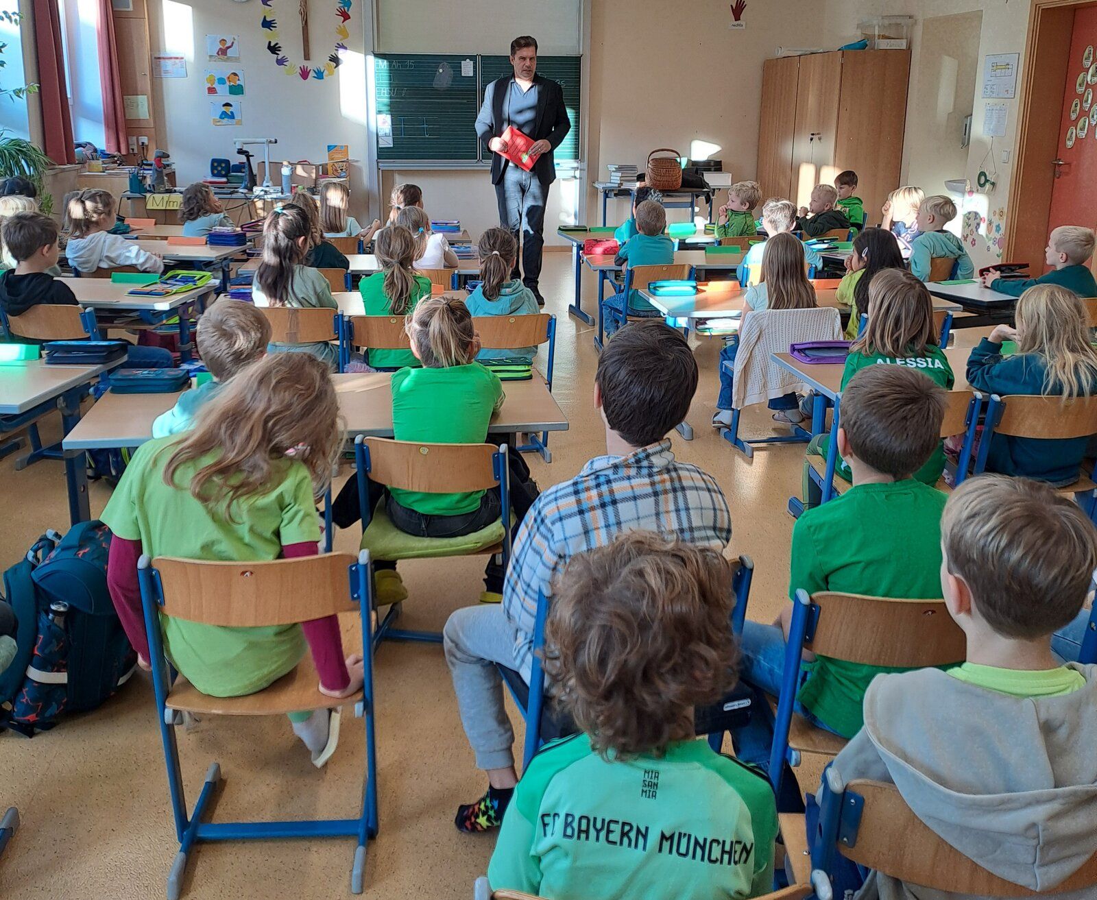 Grün gekleidet erwarteten die Kinder der 1. und 2. Klasse Herrn Pongs, der seine Zuhörer mit einem Ausschnitt aus dem Buch "Krokofil - Der Traumländer" in seinen Bann zog. Mit ausdrucksvoller Stimme unterstrichen durch Gesten, Blicke und Bewegung im Klassenzimmer erzeugte er verschiedenste Bilder im Kopf der Kinder. Diese Bilder stellen einen Reichtum dar, der niemandem genommen werden kann, erklärte Armin Pongs den Schülern. Er plädierte eindringlich dafür, bis zum 12. Lebensjahr auf Computerspiele zu verzichten, da diese sich sehr negativ auswirken. Wie im Flug verging die Vorlesestunde, die Kinder blieben hochkonzentriert. Manche besorgten sich das Buch, um zu Hause zu erfahren, wie die Geschichte von dem besonderen Krokodil endet.