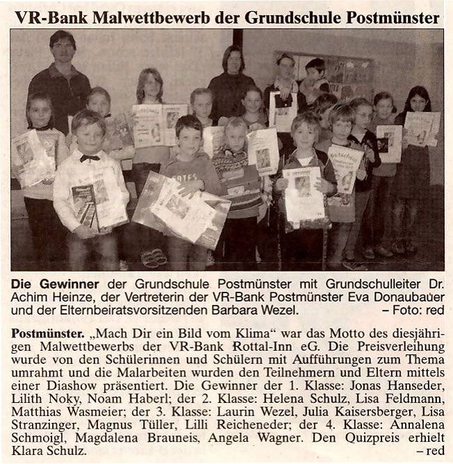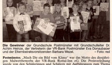 Postmünster. „Mach Dir ein Bild vom Klima“ war das Motto des diesjährigen Malwettbewerbs der VR-Bank Rottal-Inn eG. Die Preisverleihung wurde von den Schülerinnen und Schülern mit Aufführungen zum Thema umrahmt und die Malarbeiten wurden den Teilnehmern und Eltern mittels einer Diashow präsentiert. Die Gewinner der 1. Klasse: Jonas Hanseder, Lilith Noky, Noam Haberl; der 2. Klasse: Helena Schulz, Lisa Feldmann, Matthias Wasmeier; der 3. Klasse: Laurin Wezel, Julia Kaisersberger, Lisa Stranzinger, Magnus Tüller, Lilli Reicheneder; der 4. Klasse: Annalena Schmoigl, Magdalena Brauneis, Angela Wagner. Den Quizpreis erhielt Klara Schulz. -red