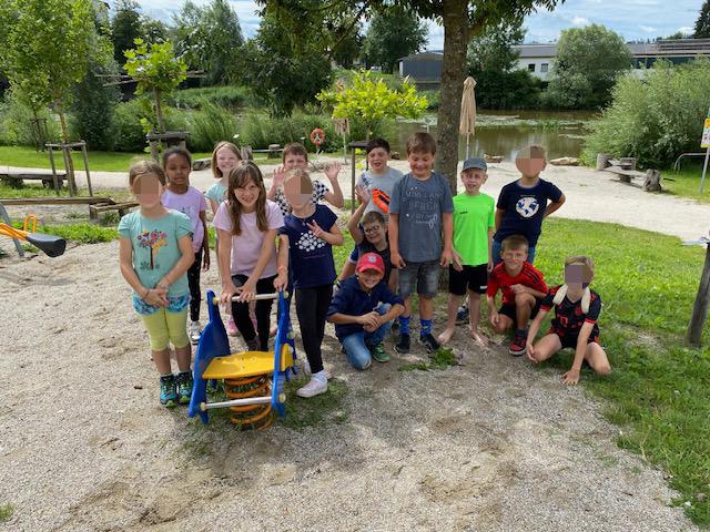 Nach einem kurzen Regenschauer machte sich die 2. Klasse mit ihren Lehrerinnen Frau Vogl und Frau Burner am Donnerstag, den 4. Juli 2024 kurz nach Schulbeginn gut gelaunt auf den Weg. Unser Ziel waren die Rottauen. Auf dem schönen Rad- und Wanderweg neben der Rott marschierten wir flotten Schrittes. Vorbei an den von den ehemaligen vierten Klassen gepflanzten Jahresbäumen, etlichen Fitnessparcours, der Streuobstwiese, dem Christanger Spielplatz, auf welchem wir natürlich eine kleine Spielpause einlegten und den Schrebergärten, erreichten wir auch schon unser Ziel.